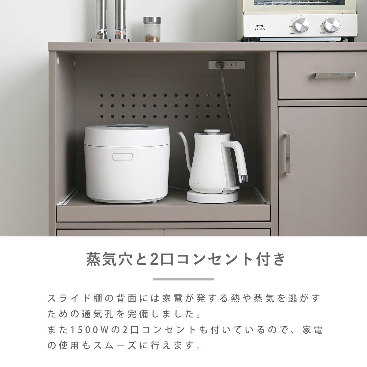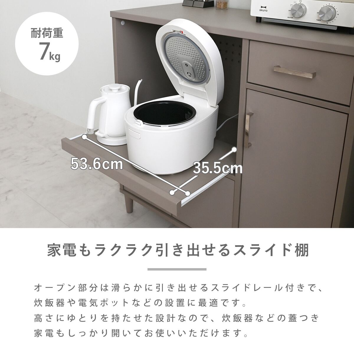 レンジや炊飯器などの家電や食器、ストック品など、キッチン回りの物をまとめて収納できる、5つの収納スペース付き。