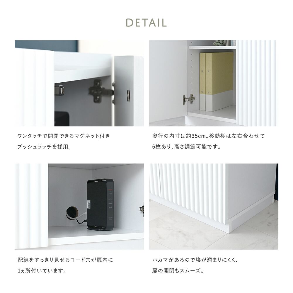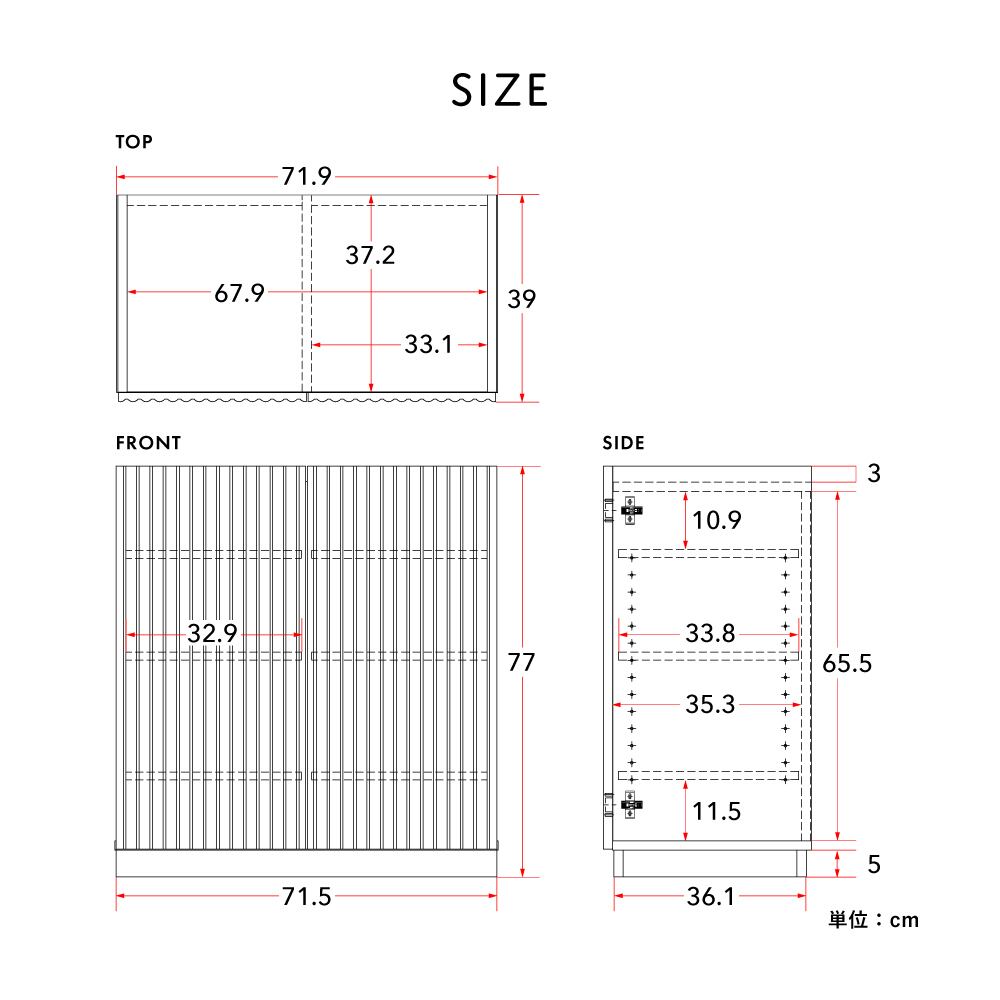主材:[本体]プリント紙化粧繊維板、[扉・前板]合成樹脂化粧繊維板、[脚部]ラッカー塗装