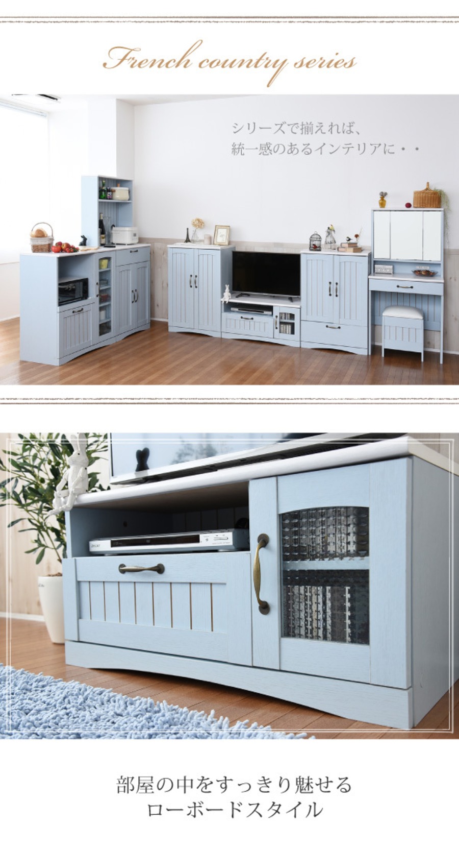バイカラーで魅せるフレンチカントリースタイルのキャビネット。コンパクトサイズなので一人暮らしにも最適。