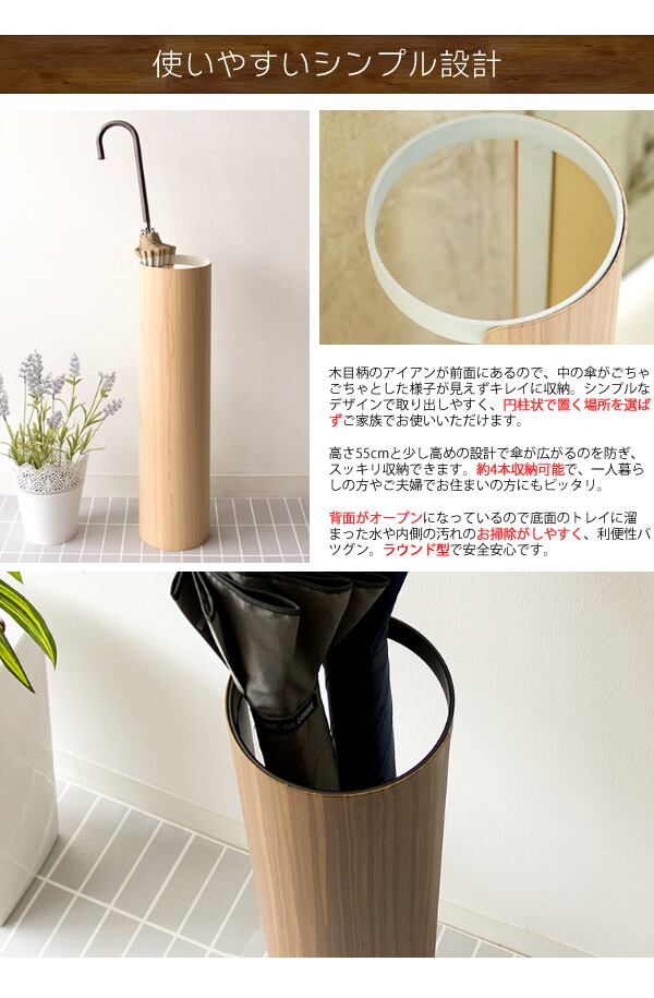 シンプルで取り出しやすいラウンド型で、径13cmと狭い玄関にも置けて傘を約4本収納できるので一人暮らしやご夫婦でお住まいの方にピッタリ。