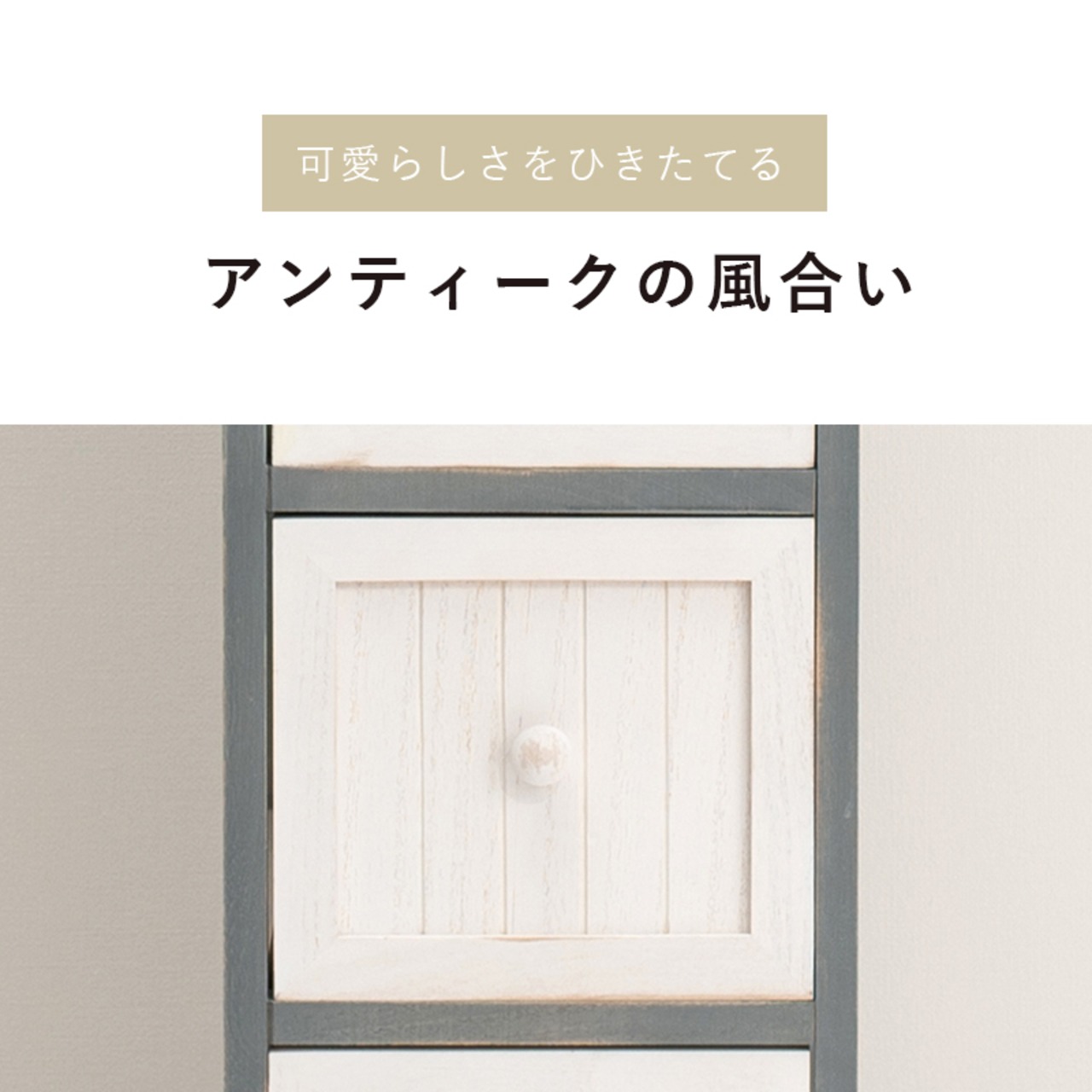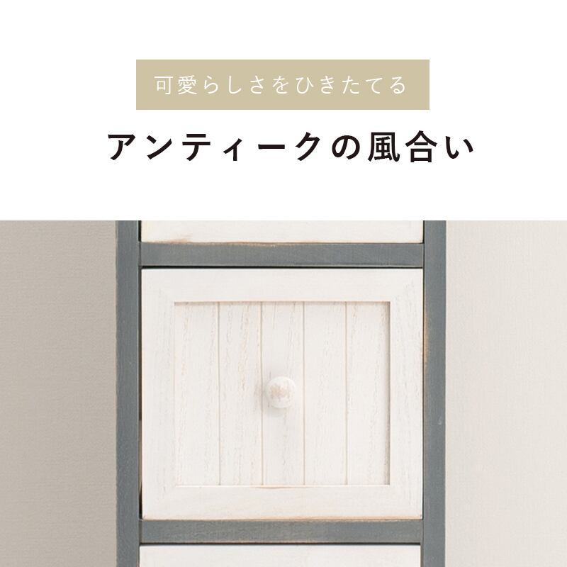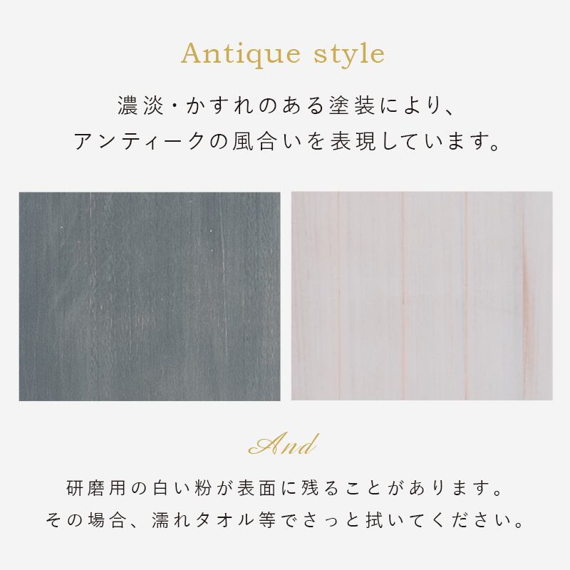 長年愛用した様なアンティーク加工、ノスタルジックなシャビー感で空間を可愛らしく演出してくれます!