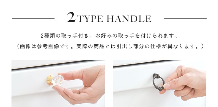フェミニンなクリスタルの取っ手とアンティーク調の取っ手がついておりお好みのものから選べます。