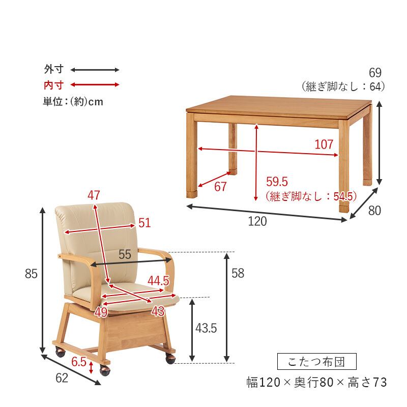 コタツ:(約)幅120×奥行80×高さ64/69cm